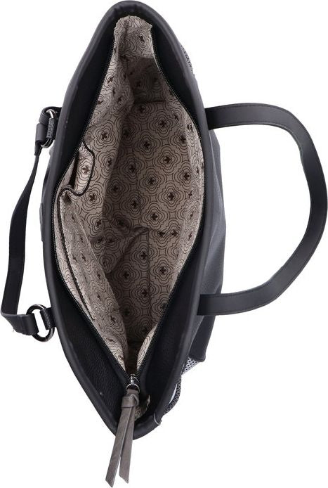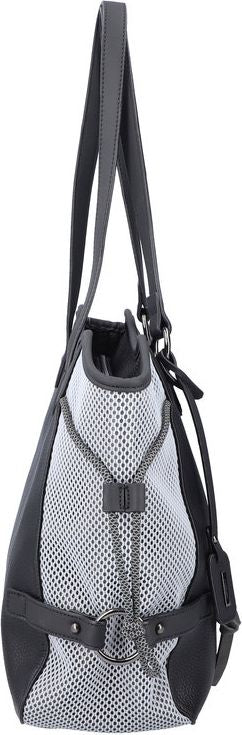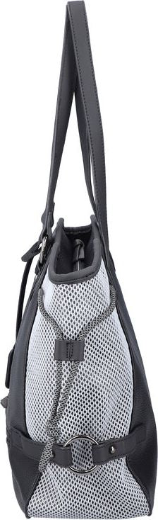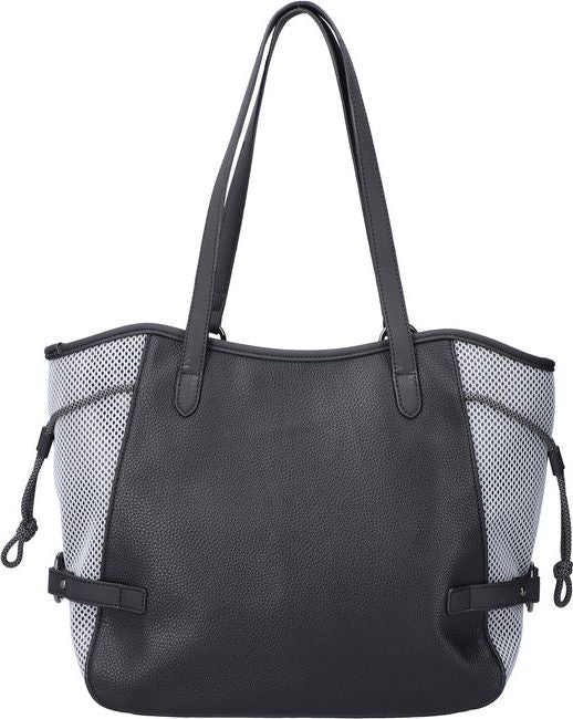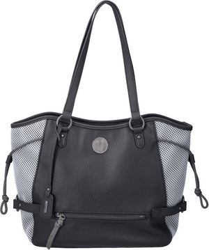 Black tote bag with grey mesh side panels, dual shoulder straps, zippered bottom pocket, and decorative tag.