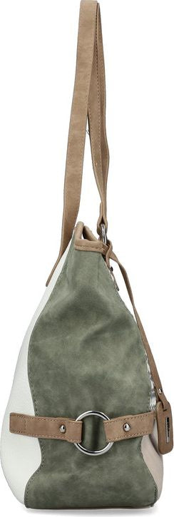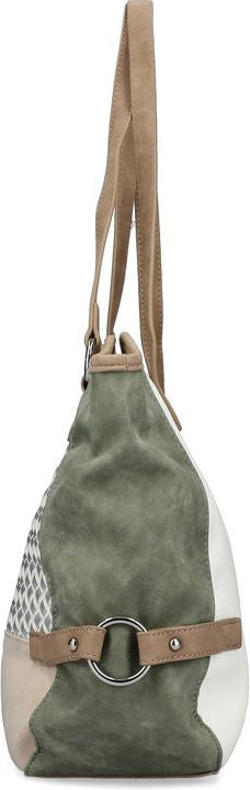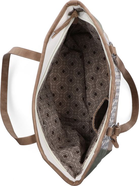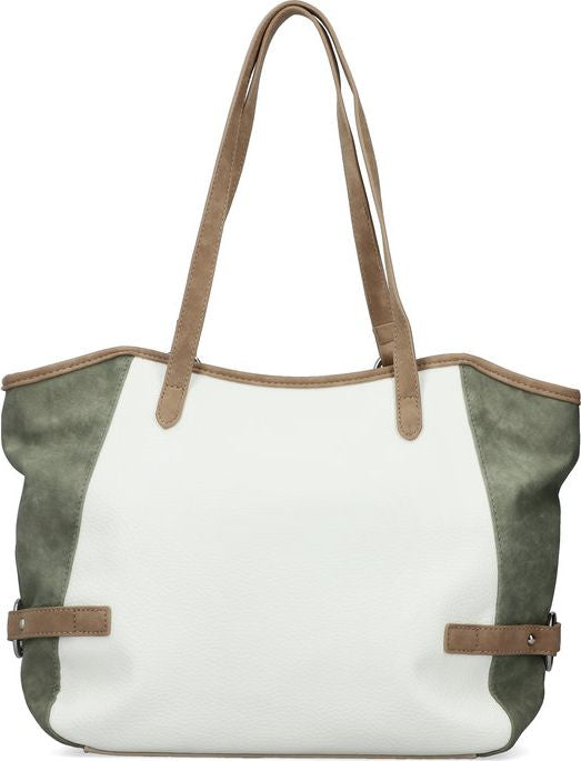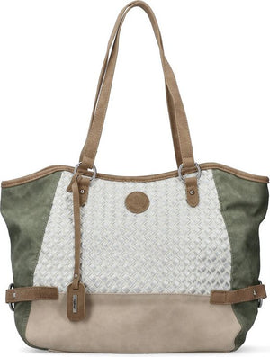 Shoulder bag with braided white center, khaki sides, tan base, and tan handles.