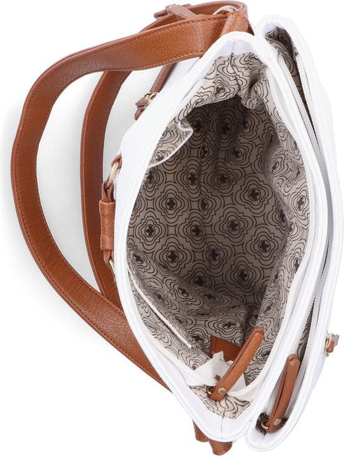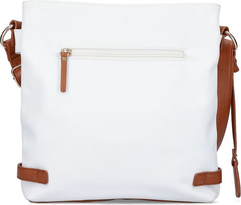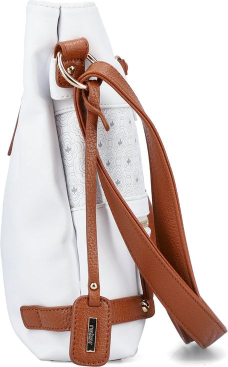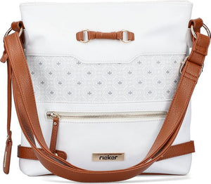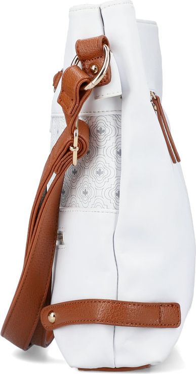 This stylish women's crossbody Purse by Rieker will be your ideal companion for every day. The combination of a smooth white upper and brown straps and accessories make the bag a stylish piece. The handbag is decorated with printed patterns and the Rieker logo on the front. There is a sewn-in zippered pocket for your small items on the front and back. At the upper edge, the bag has two zippers, which, when unzipped, open the inner pockets, where there are small pockets. The bag has a long strap that you can adjust to your chosen length. Thanks to its color, you can easily match it with shoes from our offer and you will be chic.