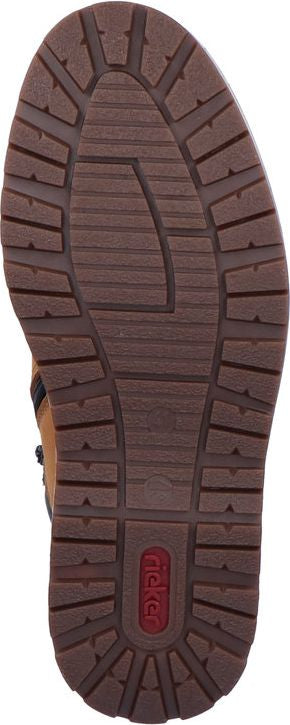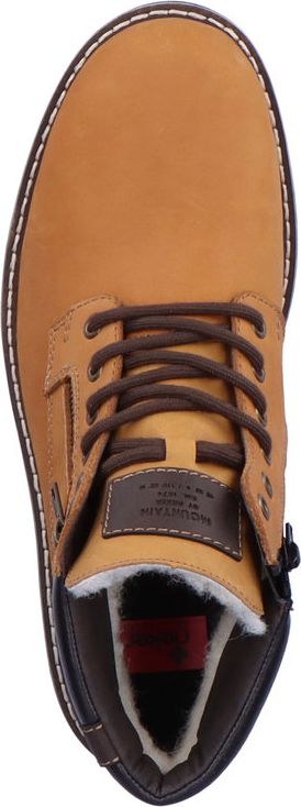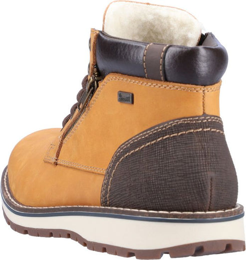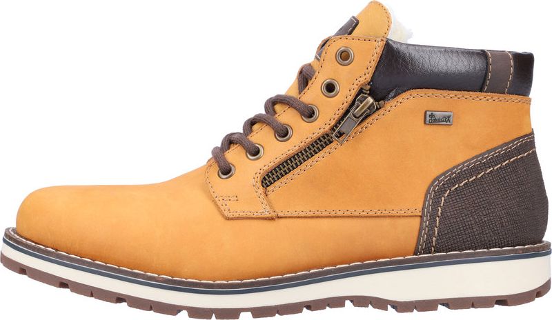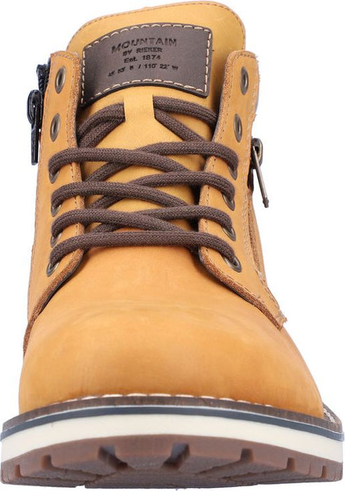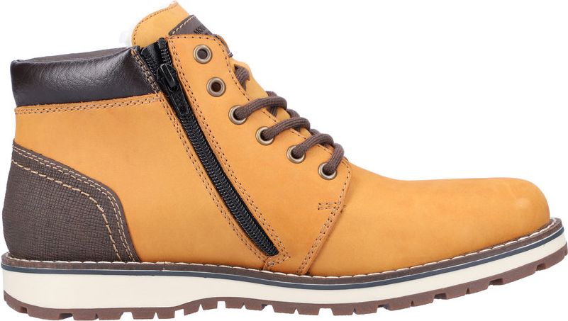 A tan ankle boot with side zipper, brown laces and trim, and a white and brown sole.