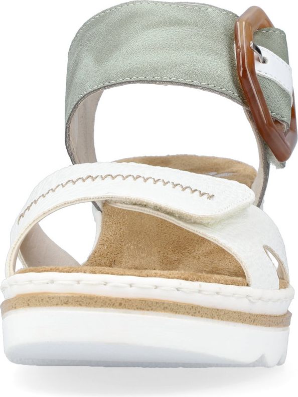 Get ready to step into summer with style and comfort wearing the White/mint Wedge With Buckle from Rieker. These elegant women's sandals are designed to ensure your every step is enjoyable. The soft synthetic footbed and flexible white outsole provide ultimate comfort and flexibility. The fashionable straps, made of imitation leather, are adorned with a decorative octagonal buckle, adding a touch of sophistication to your look. With a 5 cm wedge heel, these sandals elevate your style without compromising on comfort. The velcro closure allows for easy on and off.