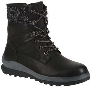 Black lace-up boot with a knitted wool-like cuff.