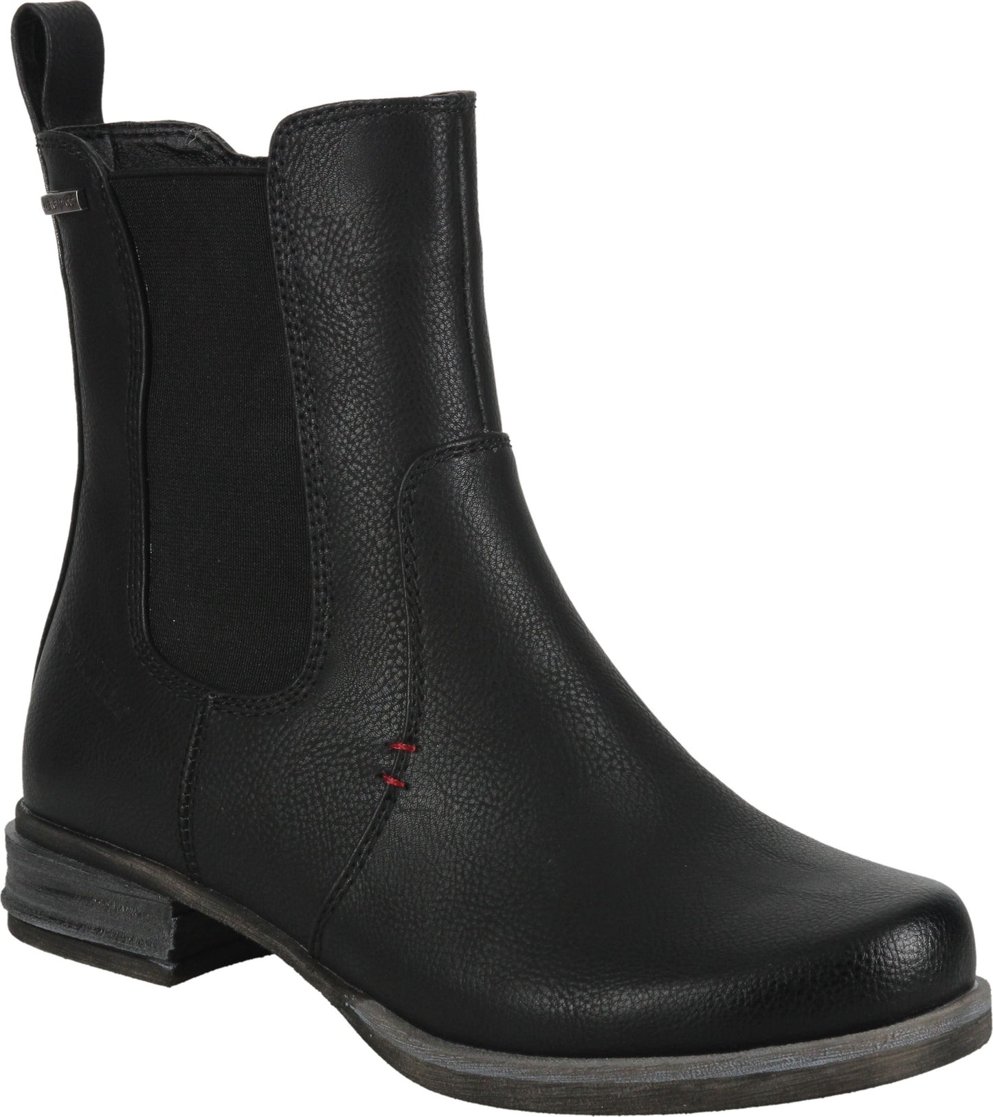 Black ankle-height leather Chelsea boot with elastic side panels and a pull tab.