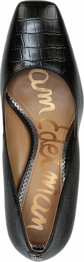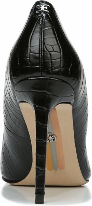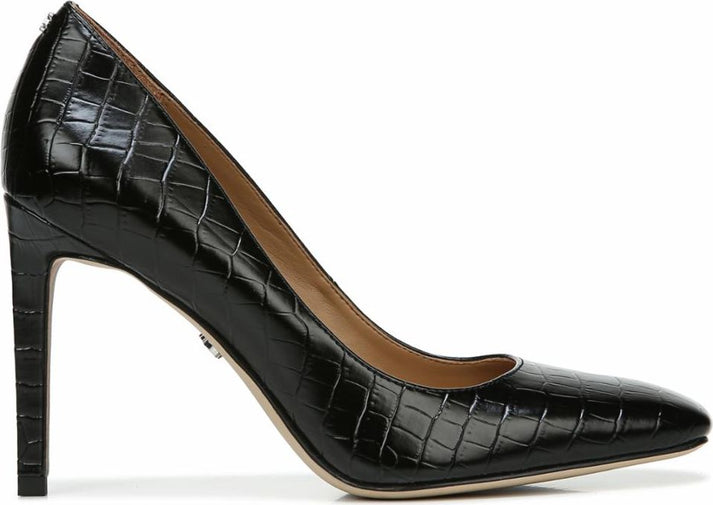 Black pump with pointed toe and stiletto heel, embossed with crocodile texture.