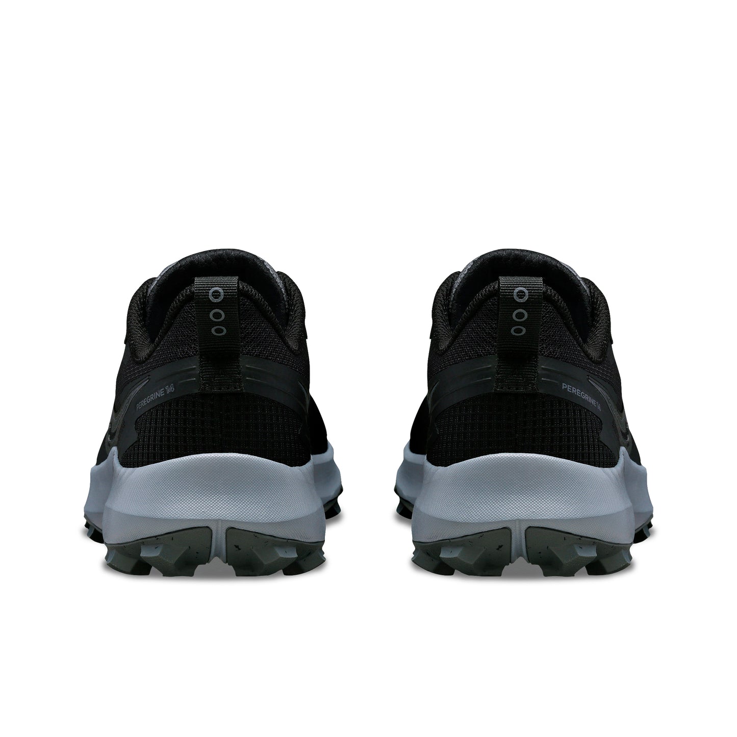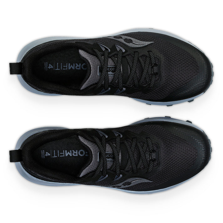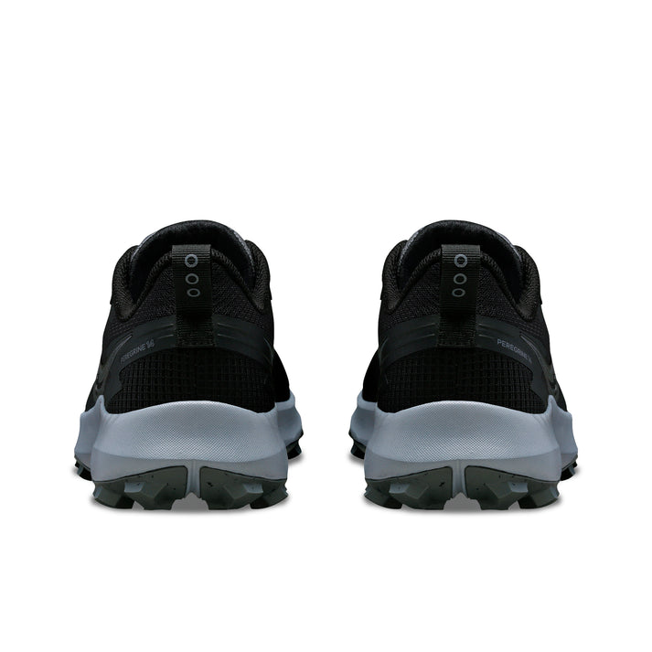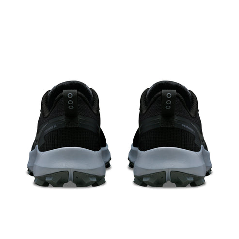 A low-rise running shoe in black with gray accents, featuring a gray sole with aggressive treads.