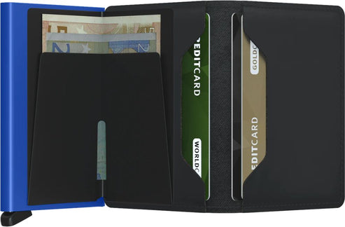 The billfold reinvented; its slim profile makes the Slimwallet fit perfectly into every pocket. The open exterior is cut extra wide to hold cards, banknotes and receipts. The Cardprotector mechanism allows you to slide out cards with one simple motion, while the aluminium protects your cards from bending, breaking and unwanted wireless communication.