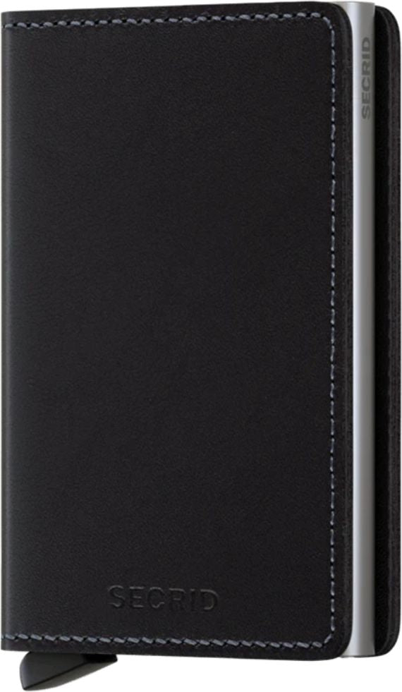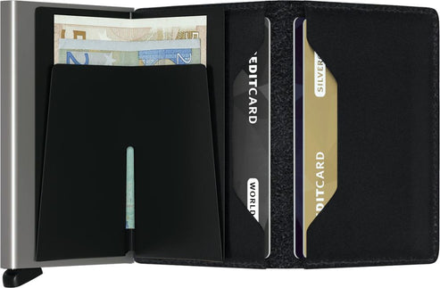The billfold reinvented; its slim profile makes the Slimwallet fit perfectly into every pocket. The open exterior is cut extra wide to hold cards, banknotes and receipts. The Cardprotector mechanism allows you to slide out cards with one simple motion, while the aluminium protects your cards from bending, breaking and unwanted wireless communication.