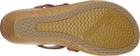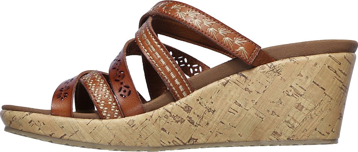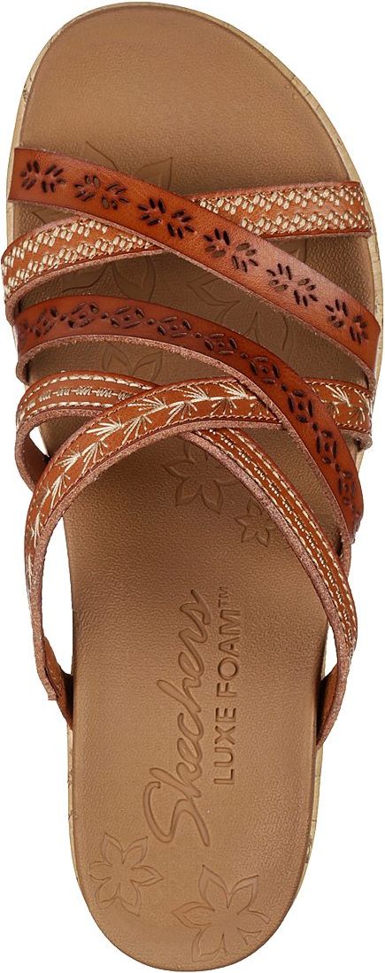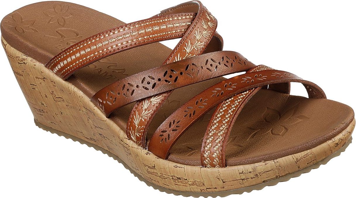 Bring the fierce style with you everywhere wearing the Cali Beverlee - Tiger Posse sandal by SKECHERS. Embroidered synthetic upper in a wedge heeled fashion strappy slide sandal with cork wedge heel and Luxe Foam footbed.