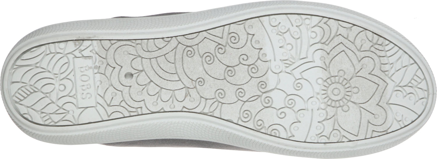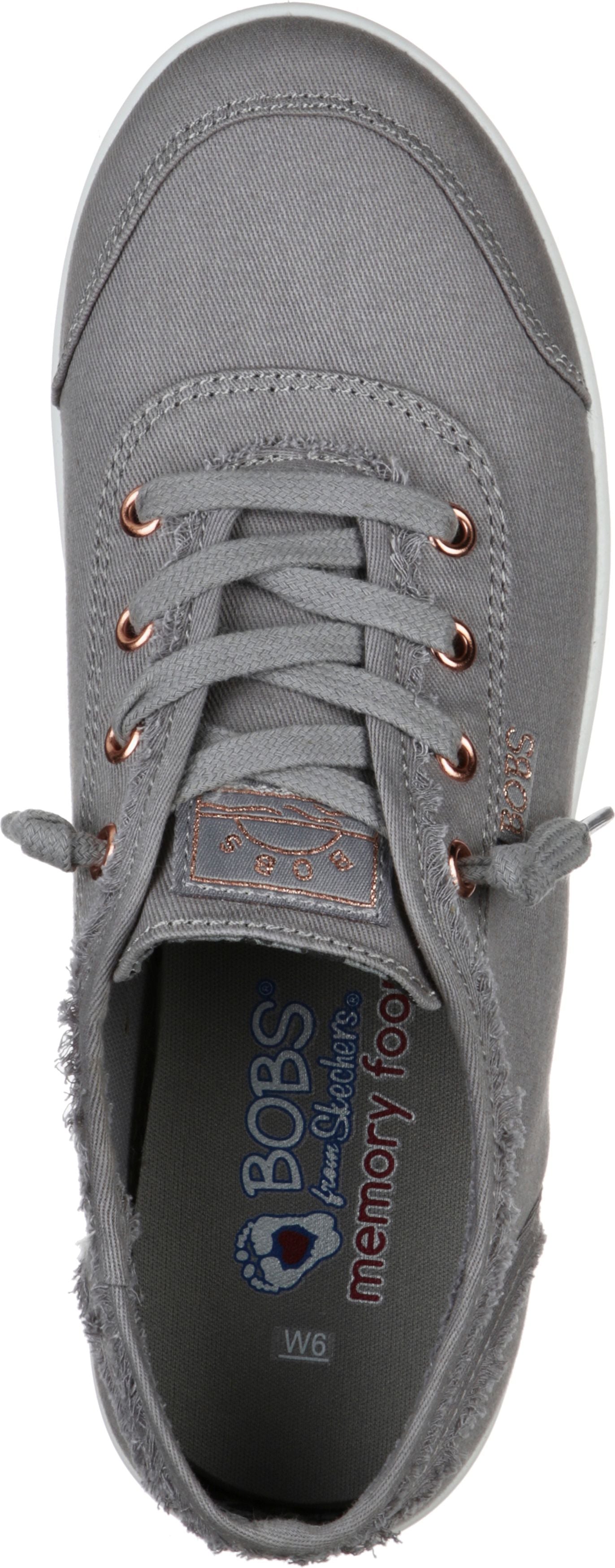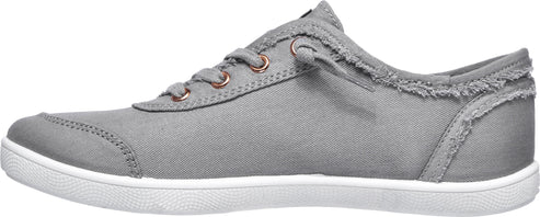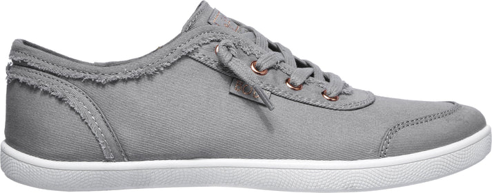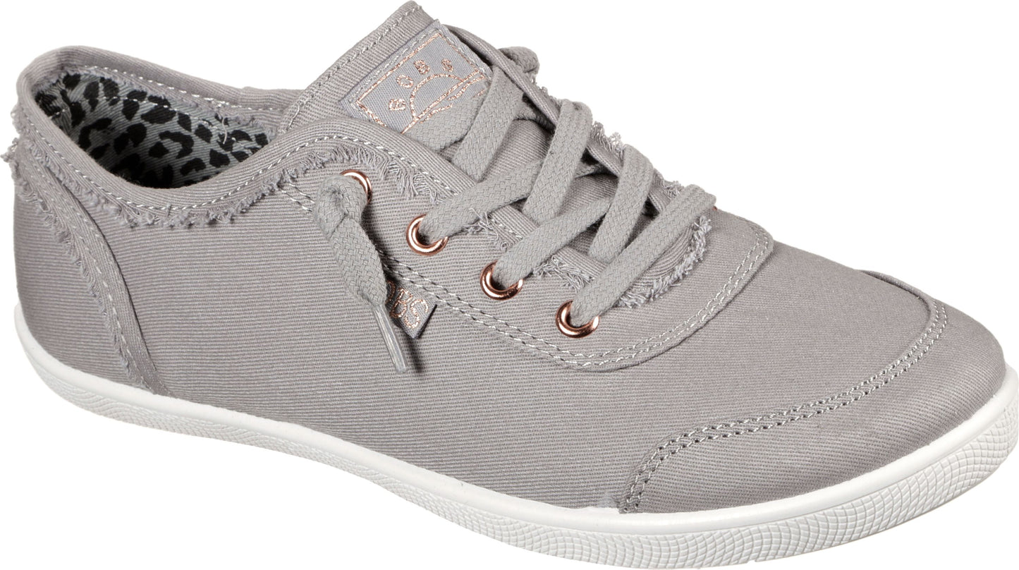 Gray canvas sneaker with white sole, lace-up closure, and animal print lining.