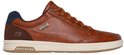 Low-cut light brown shoe with brown laces, navy lining, and a white sole.