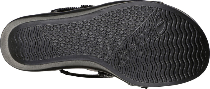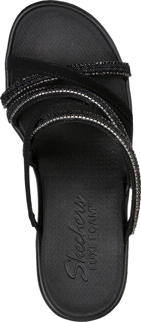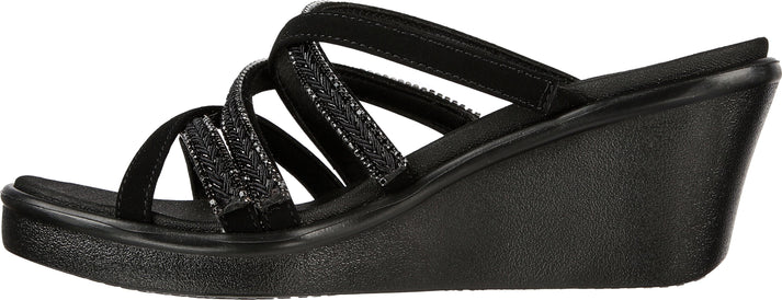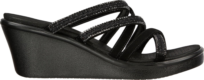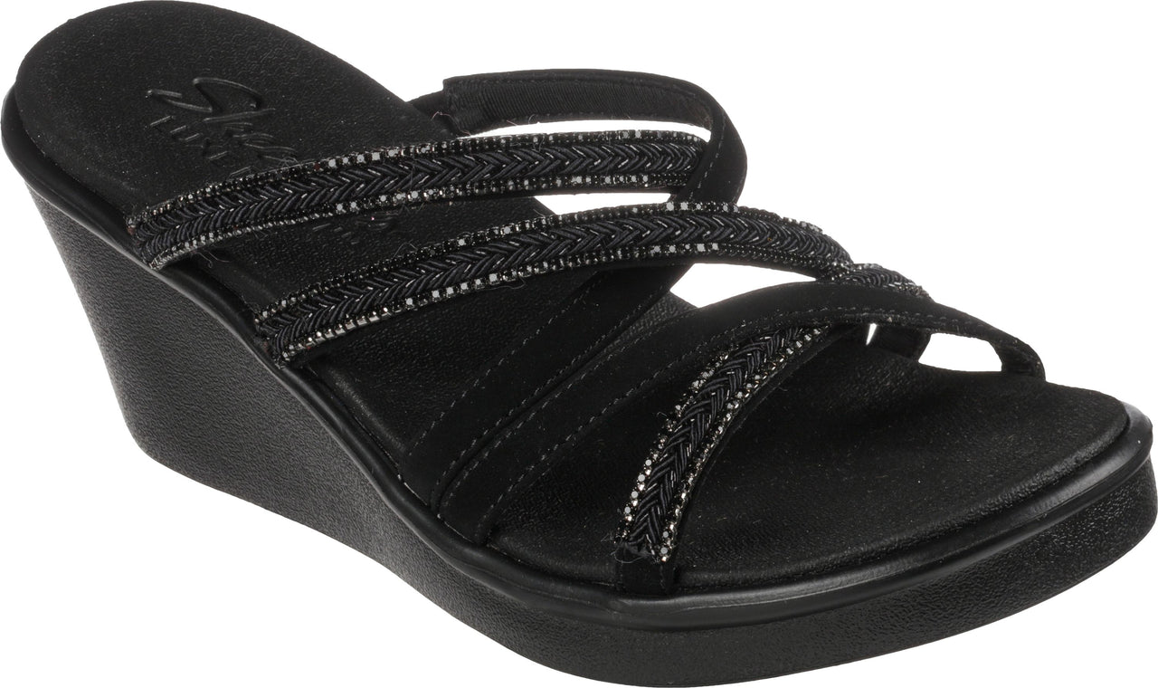 Step out with a glam look in Skechers Rumble On Night Out. This strappy wedge slide sandal features a synthetic strap upper, glittering rhinestone details and a cushioned Luxe Foam® footbed.