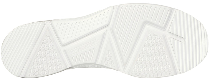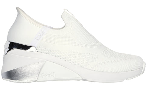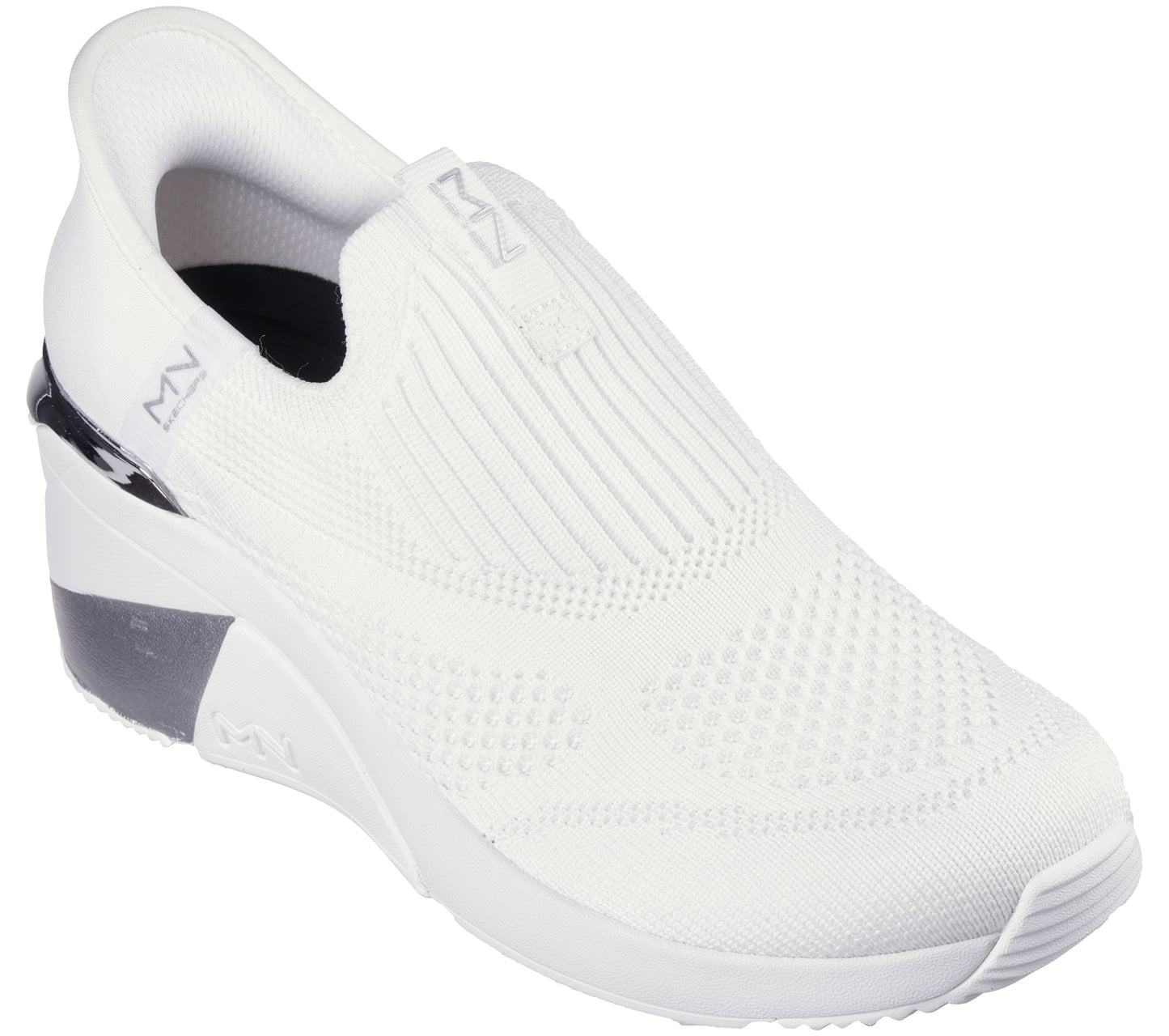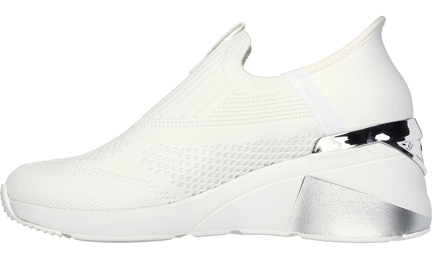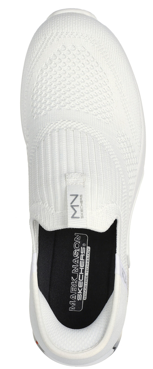 A white knit slip-on sneaker with visible ribbing at the vamp, a pull tab, and a black accent at the heel.