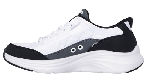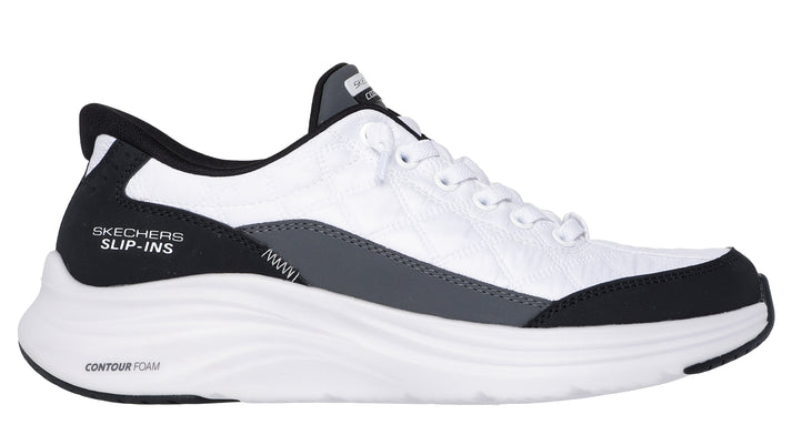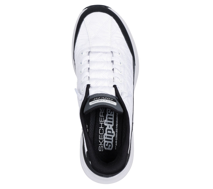 A white sneaker with black and gray accents has a 'COZY FIT' tag and 'SLIP-INS' on the side.