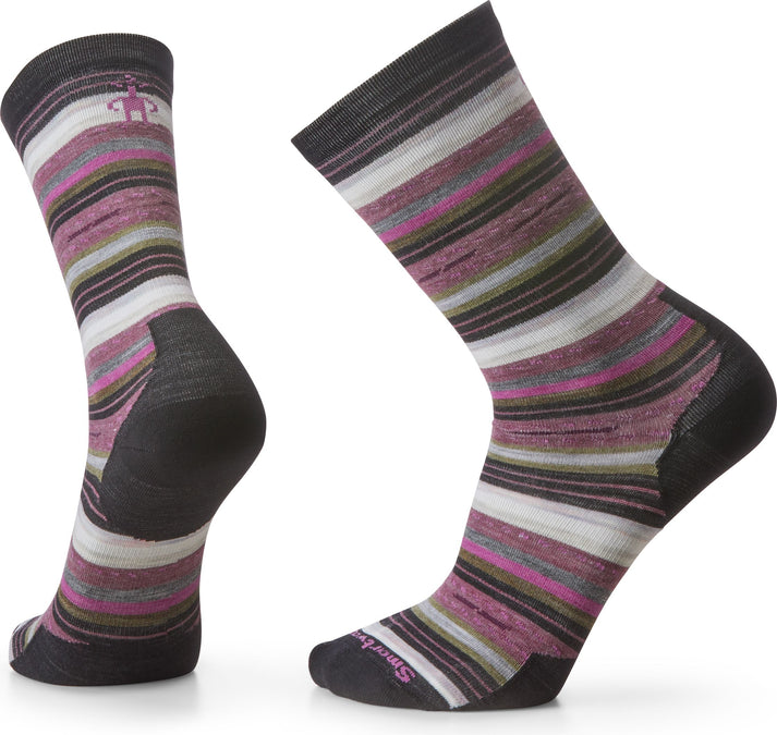 Two striped socks with dark heels and toes, the stripes are white, pink, grey and green with a stick figure logo on the side.