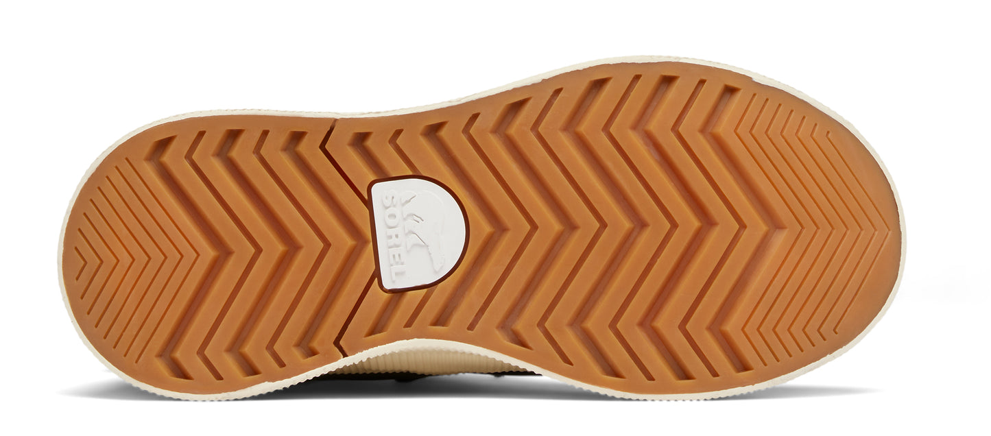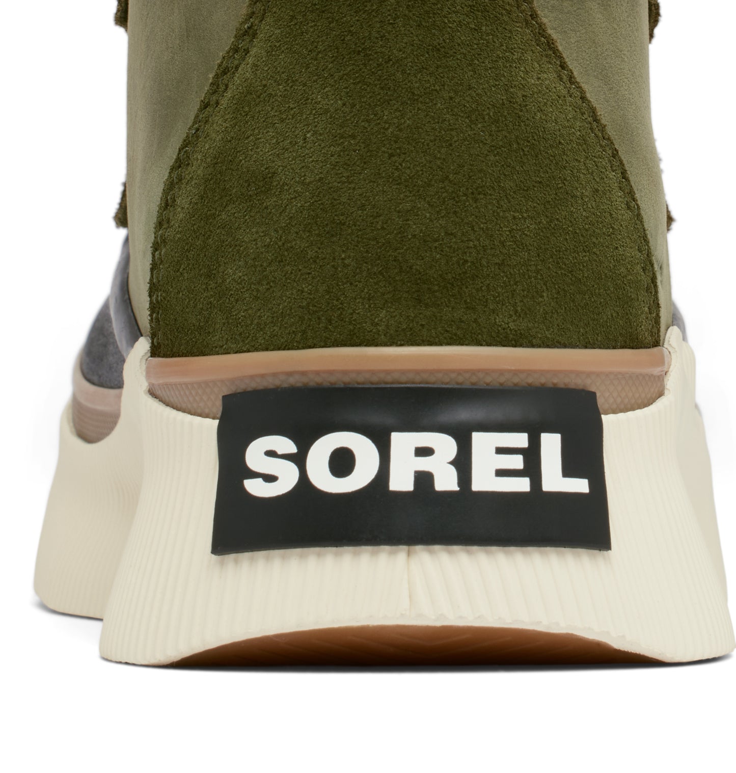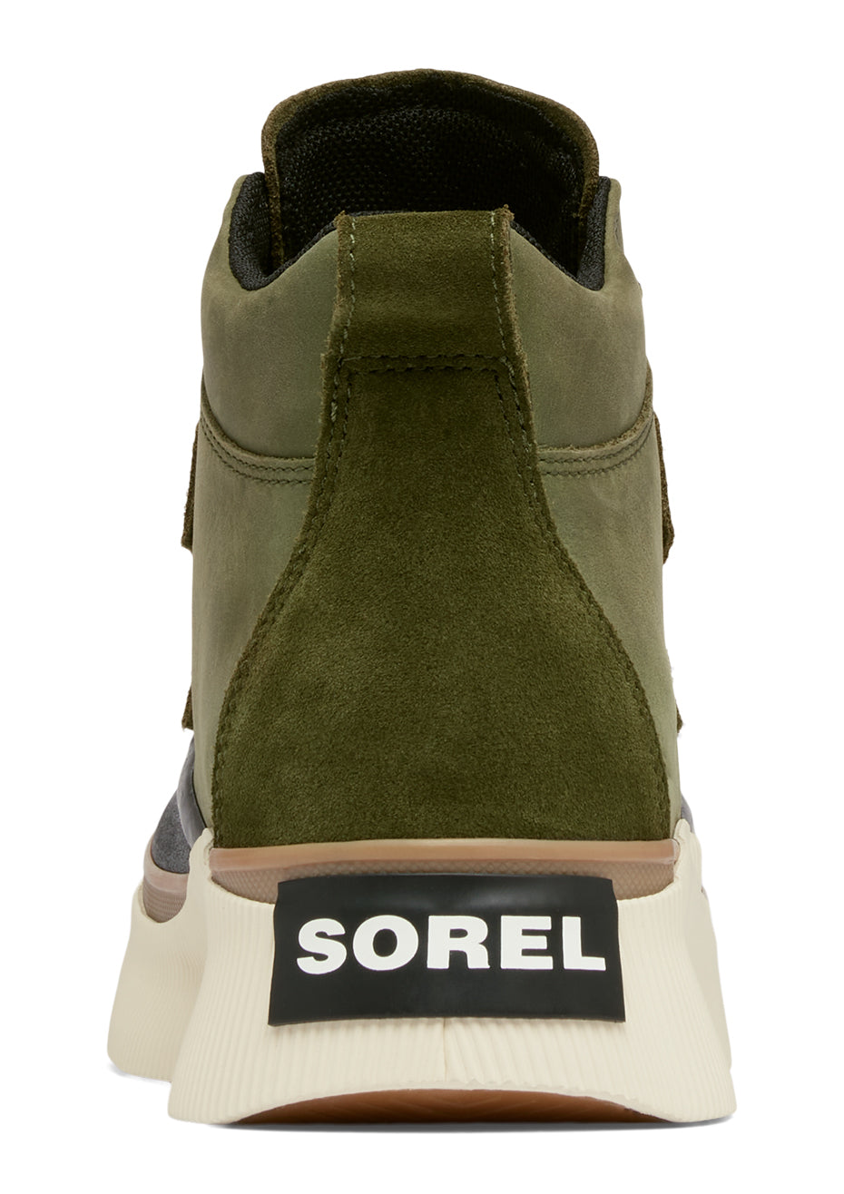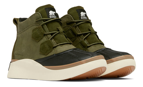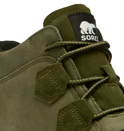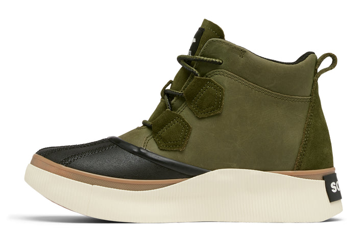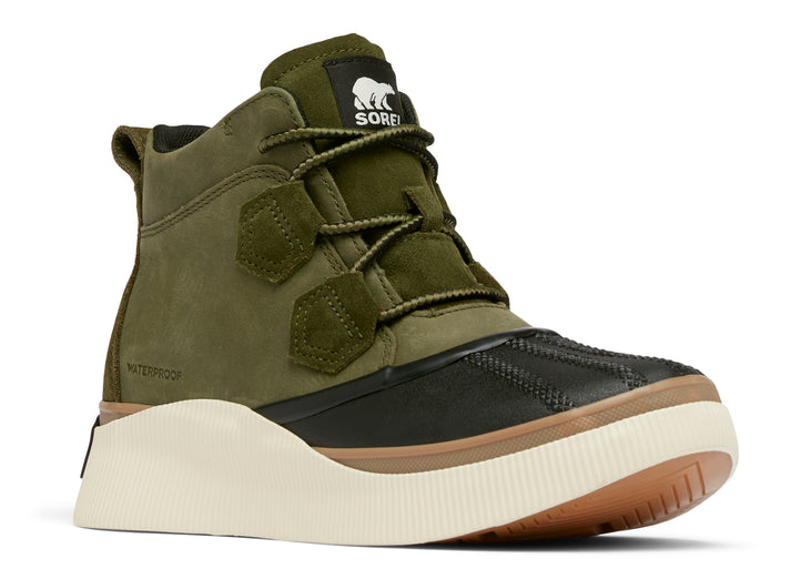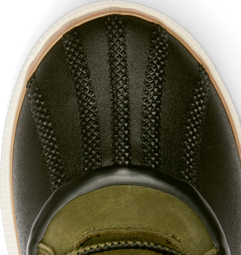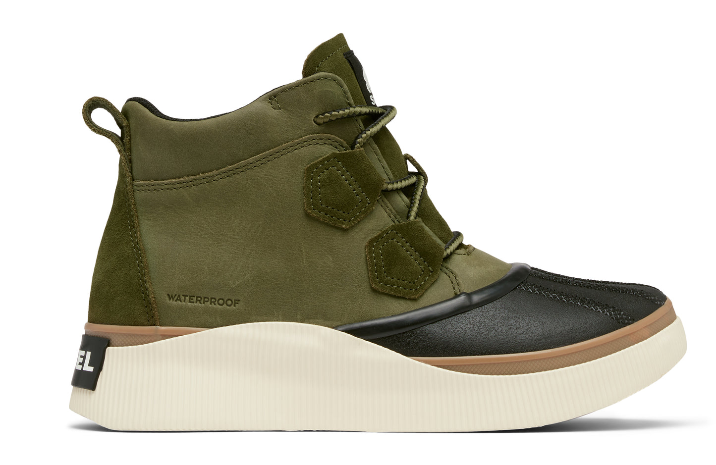 Olive green waterproof ankle boot with black toe and thick white and brown sole, featuring white bear logo and lace-up closure.