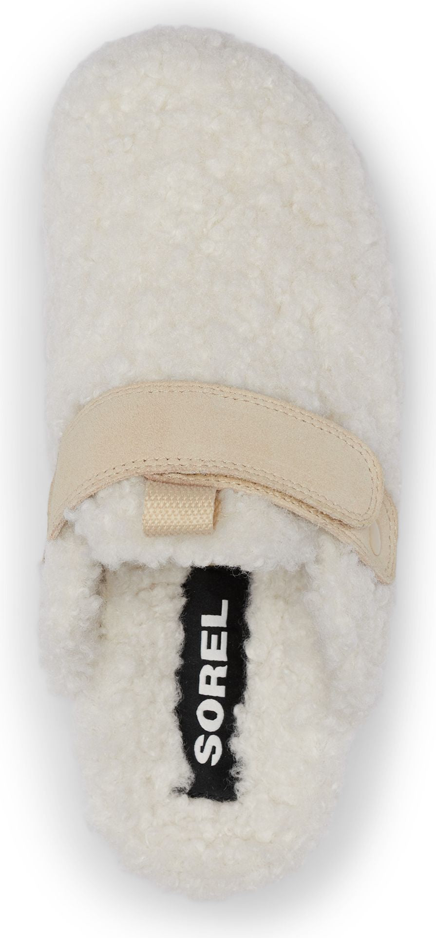 - UPPER: Faux shearling upper. Adjustable webbing strap across the midfoot. Webbing loop detail.