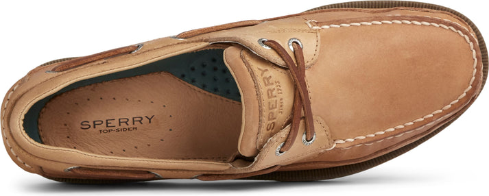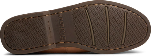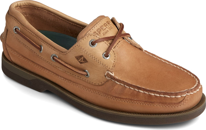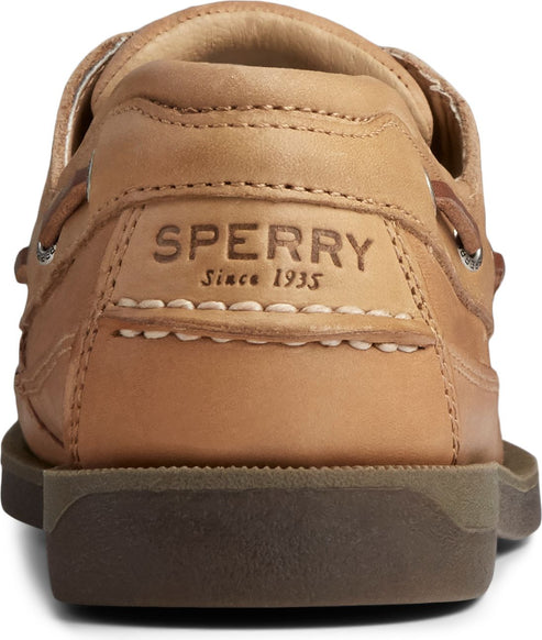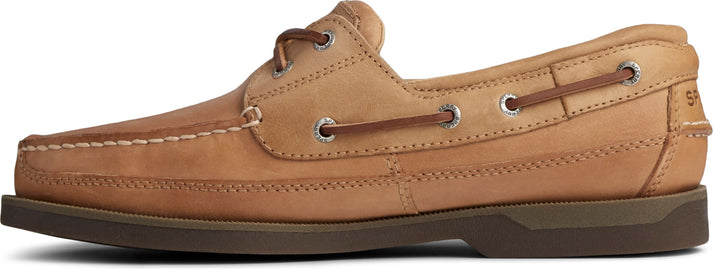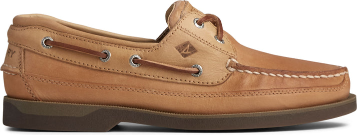 Leather boat shoe with moccasin toe, rawhide lacing, and dark sole.