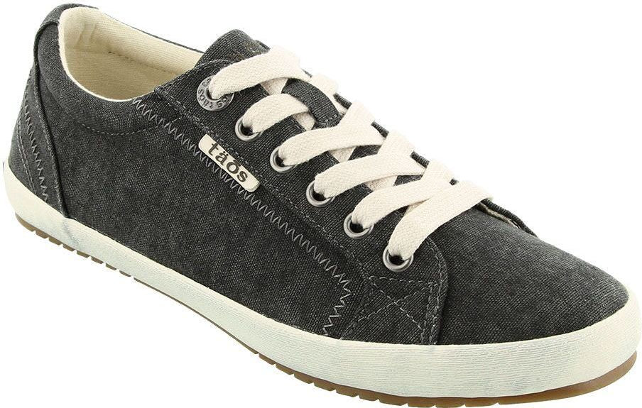 Dark grey canvas sneaker with white laces and sole, and "Taos" visible on the side.