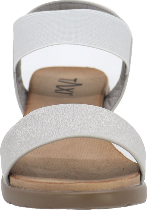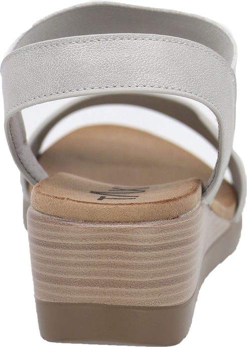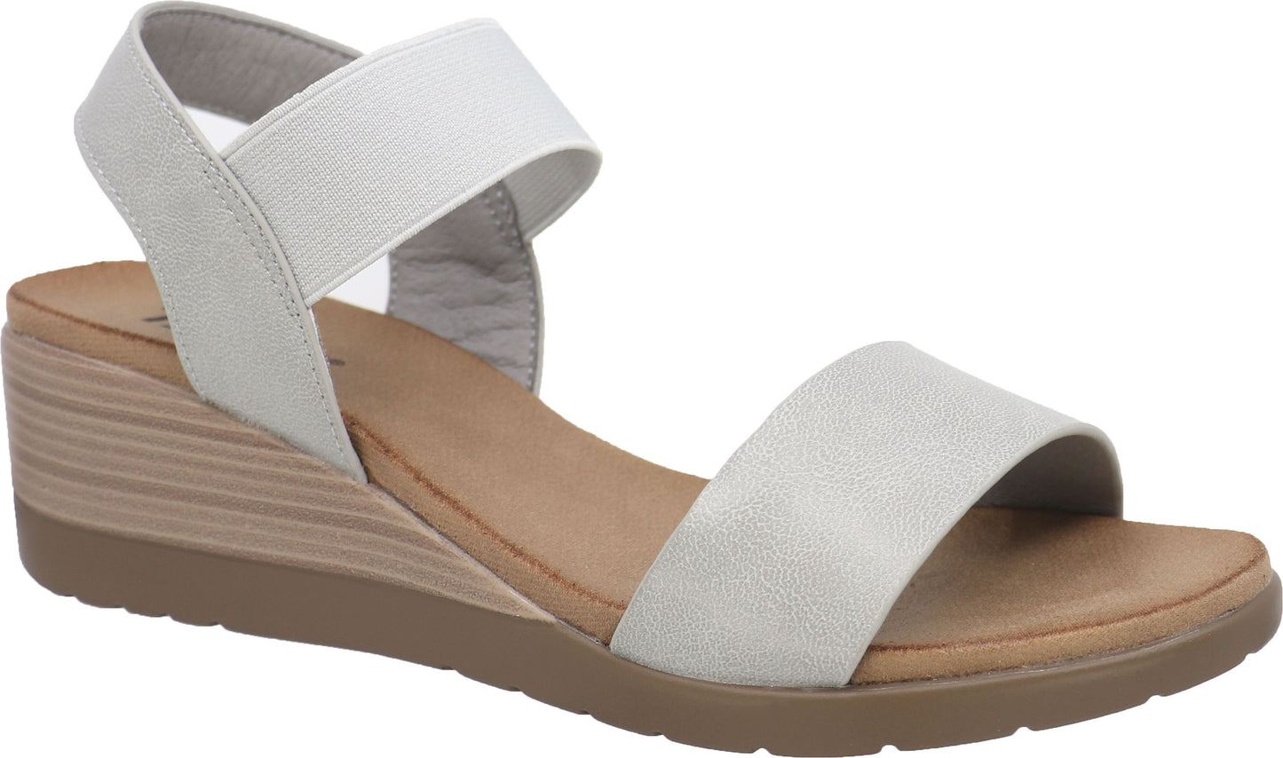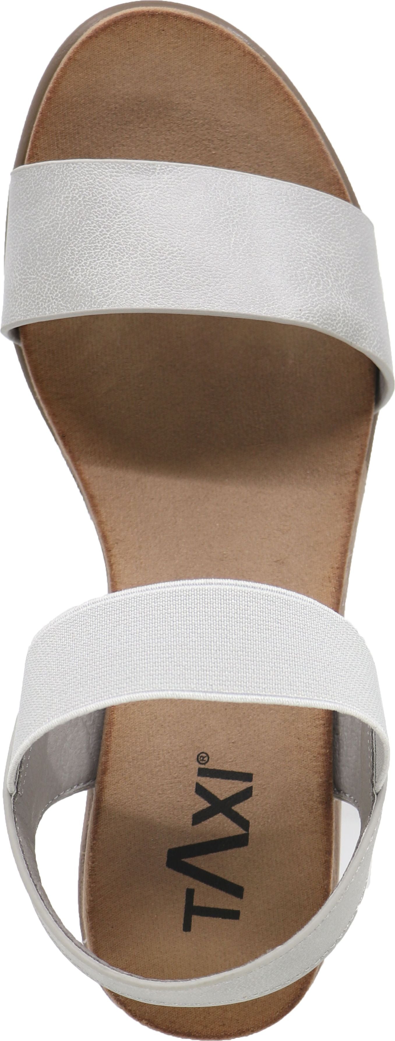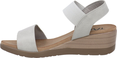 Wedge sandal with silver upper, tan insole, and elastic ankle strap.