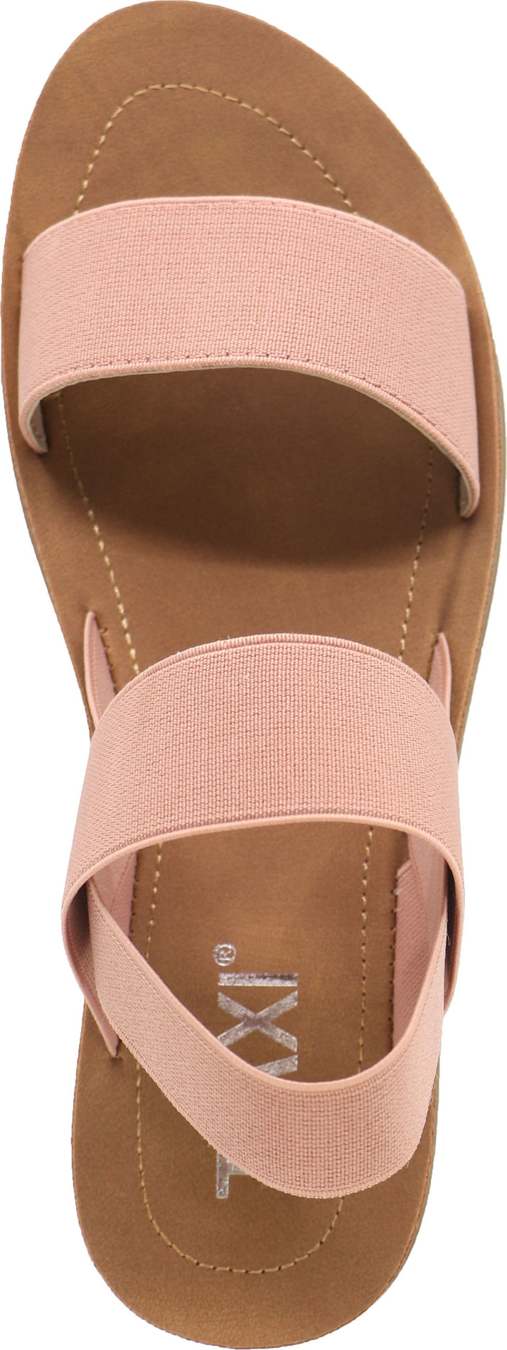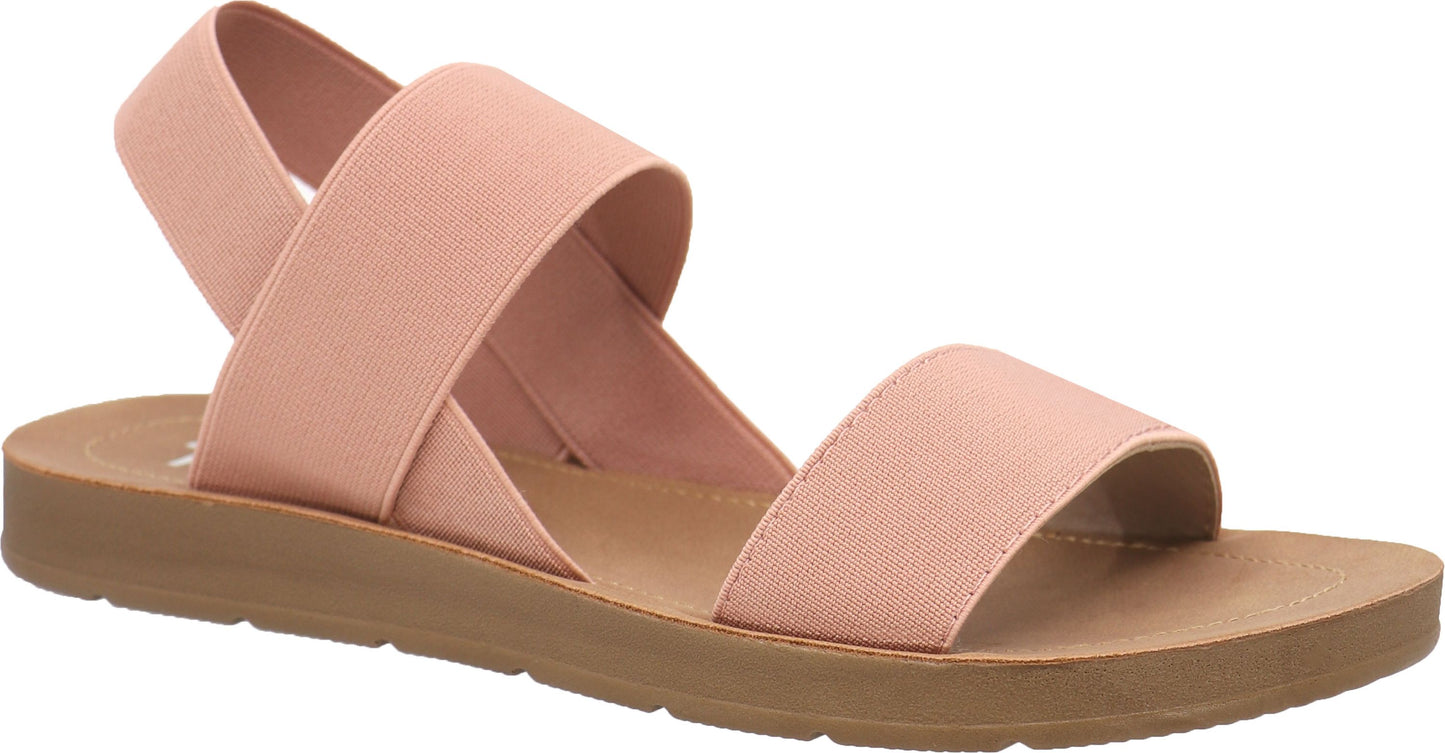 Rose pink, flat sandal with elastic straps and light brown sole.
