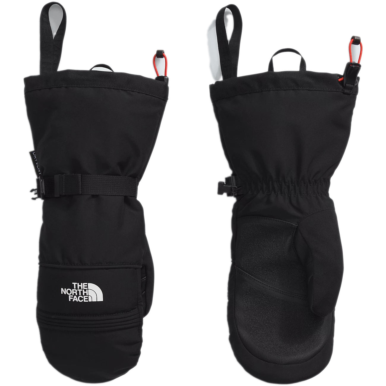 Two images of black ski mittens. One has the palm facing the viewer and shows a leather palm and thumb, the other has the back of the mitten showing a pocket on the back of the hand that has the text "THE NORTH FACE".