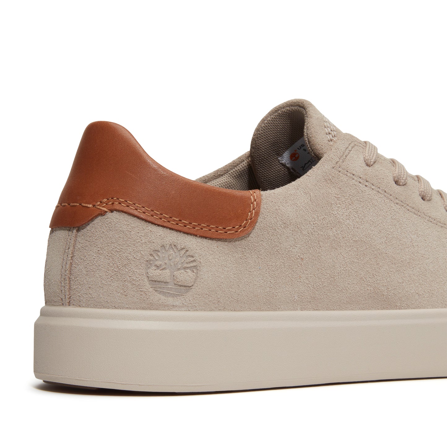 A tan canvas sneaker with a beige sole and brown leather heel accent.