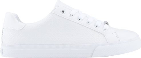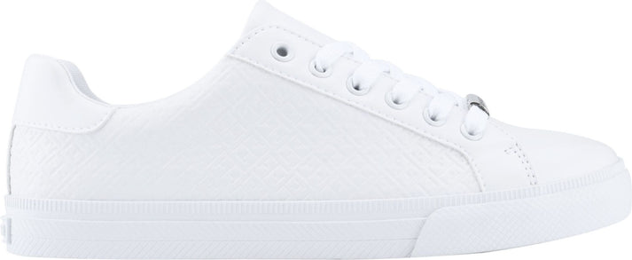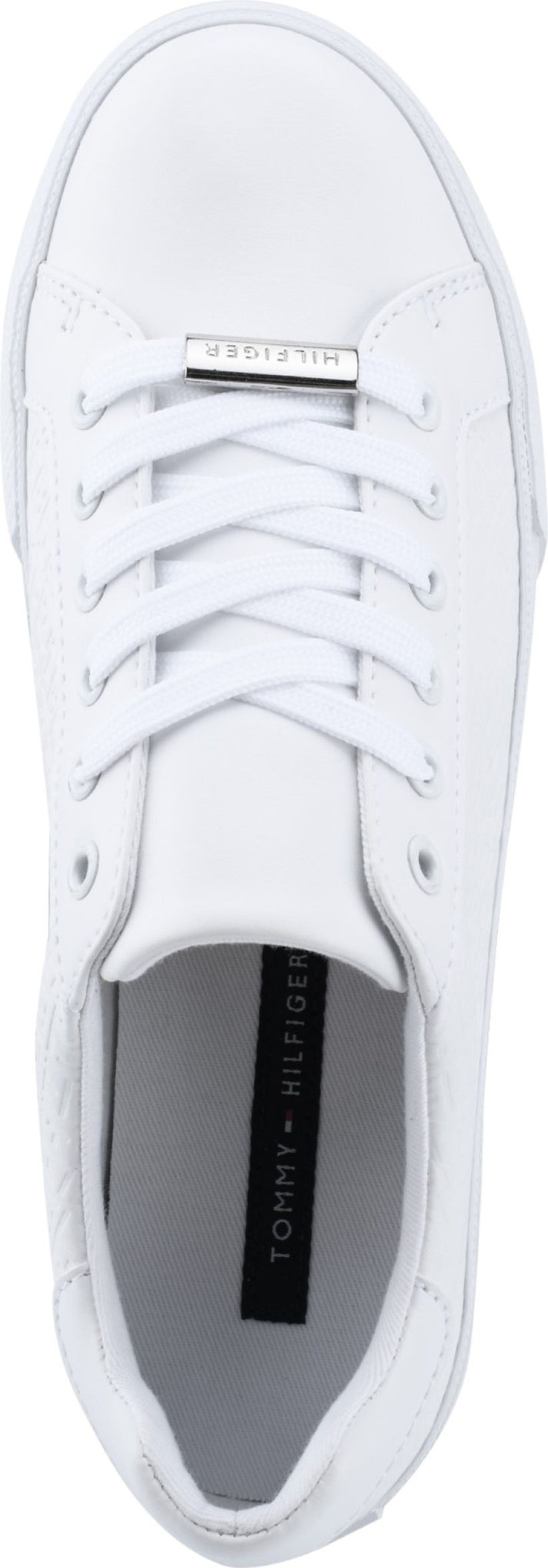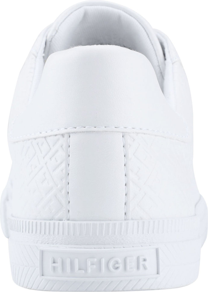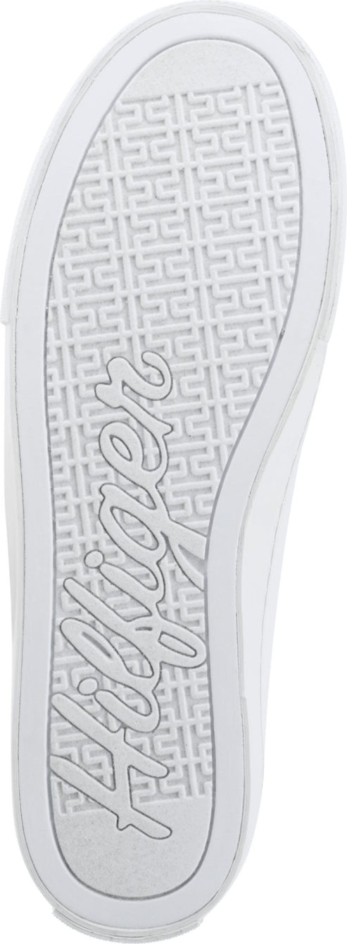 Low-top white sneaker with white laces and silver "HILFIGER" logo.