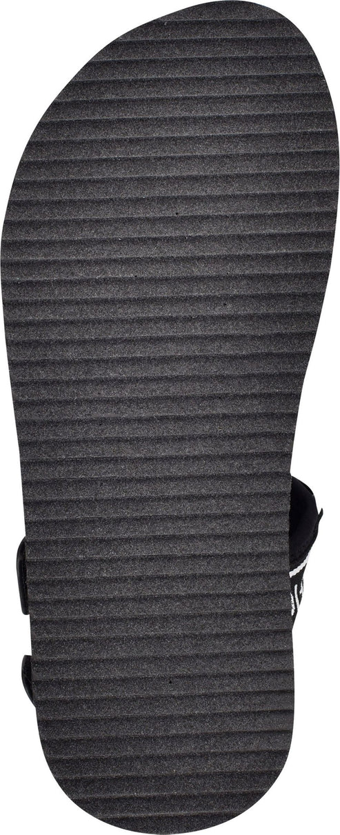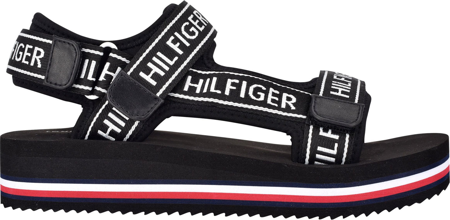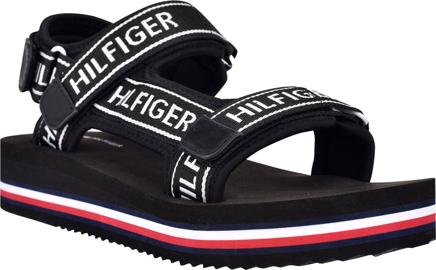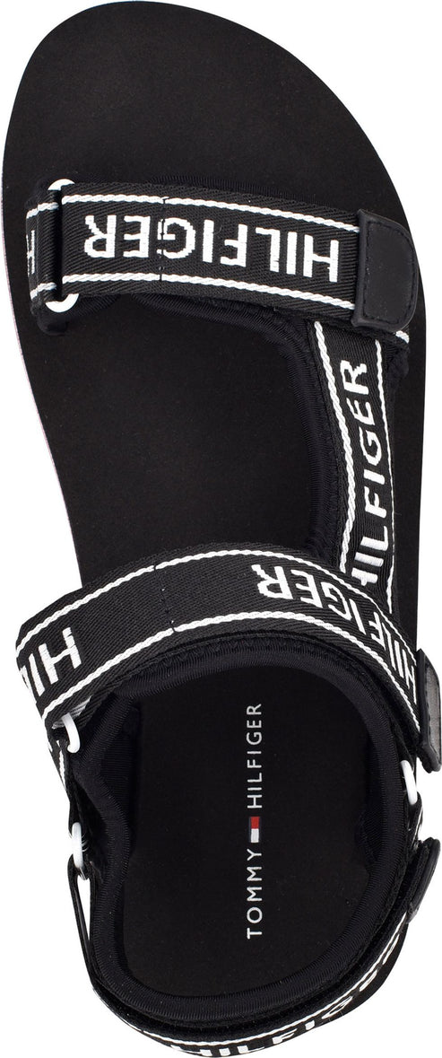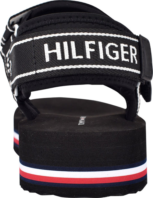 Black sandal with 'HILFIGER' printed white straps and a red, white and blue stripe on the sole.
