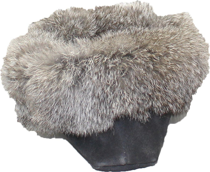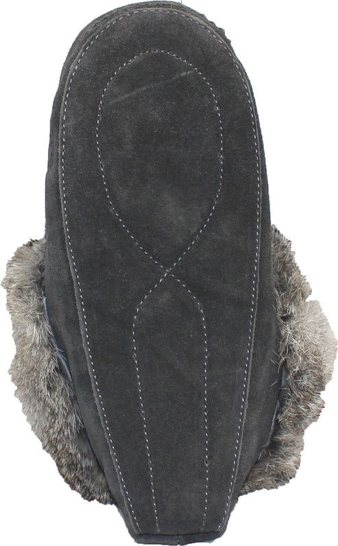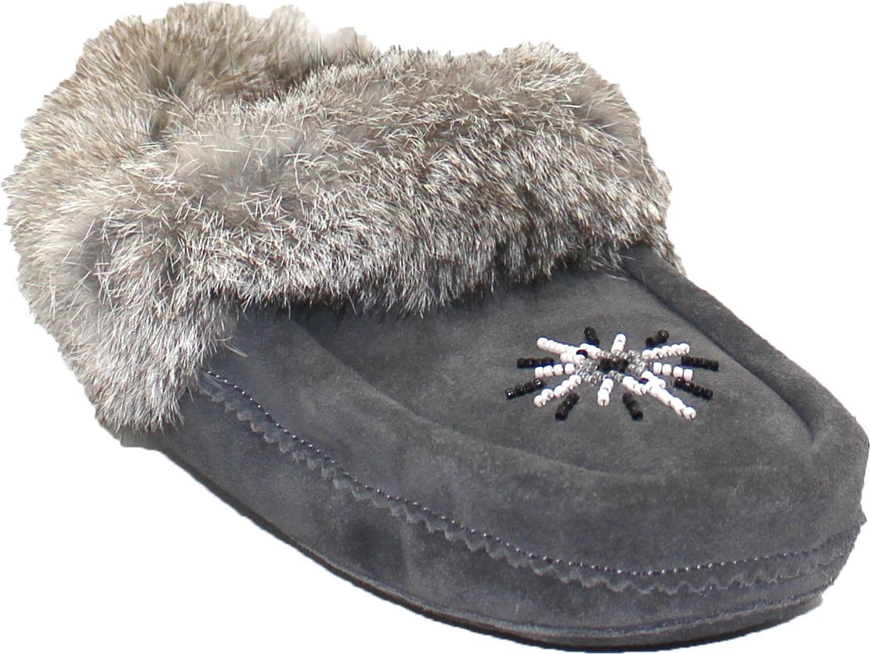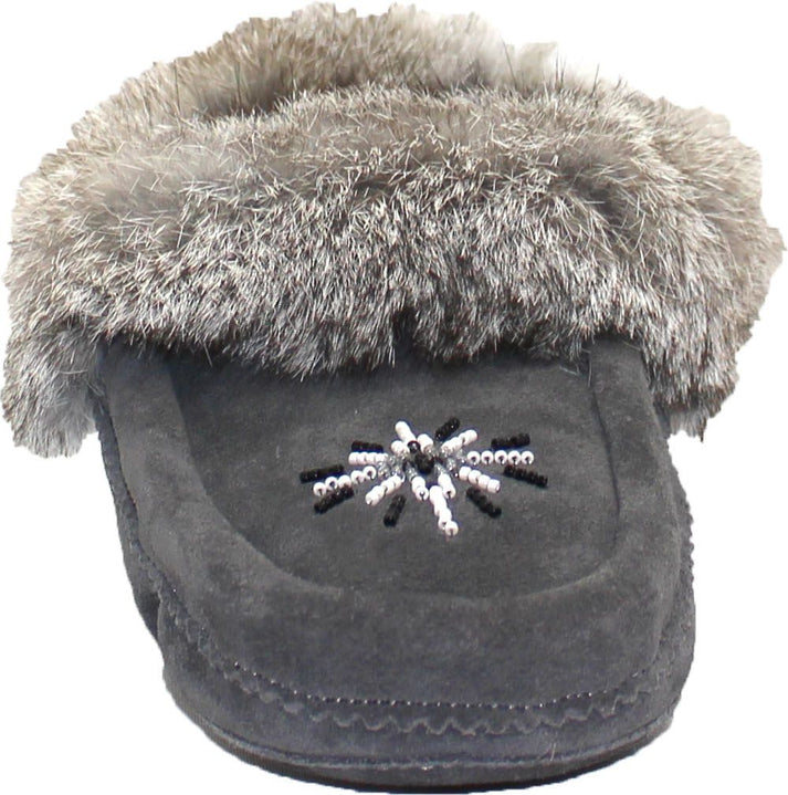 Grey suede moccasin slipper with rabbit fur trim and beaded snowflake design.