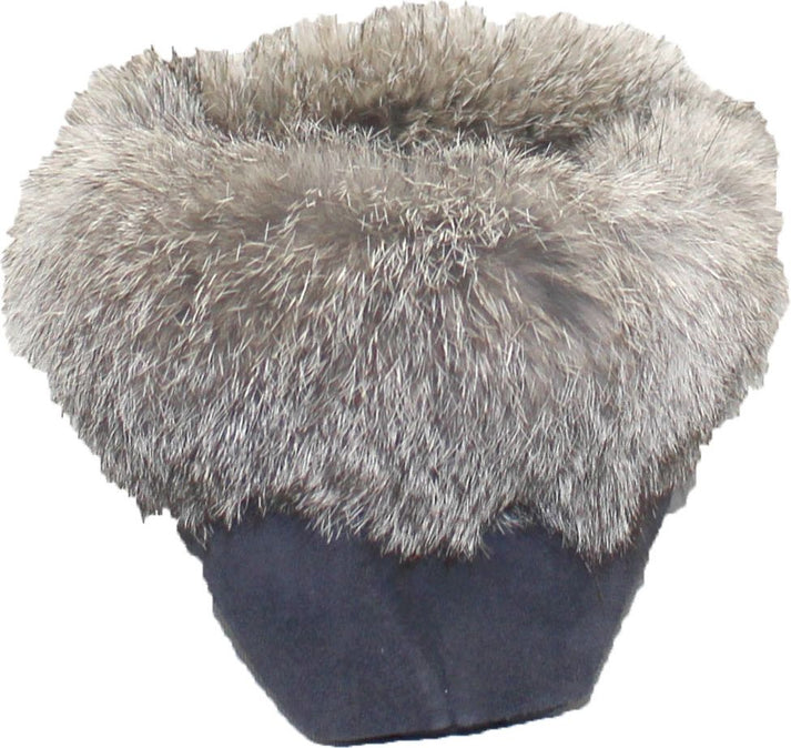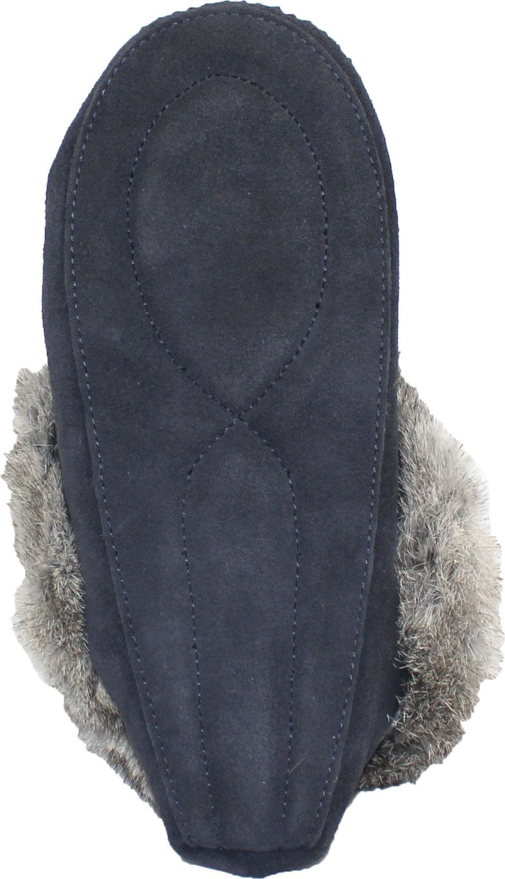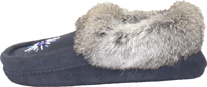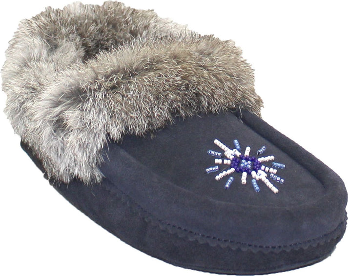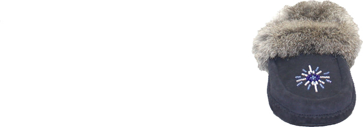 Navy suede slipper with grey fur trim and beaded snowflake design.