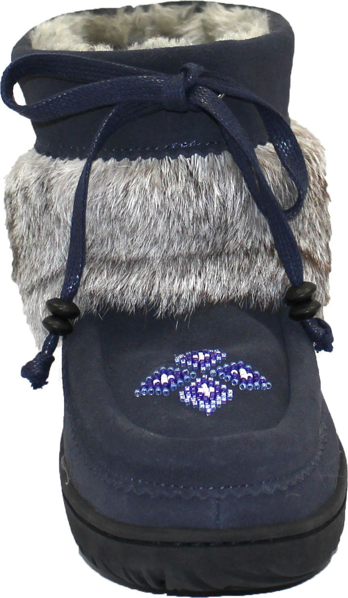 Ankle-high blue moccasin boot with fur trim, beaded design, and lace-up closure.