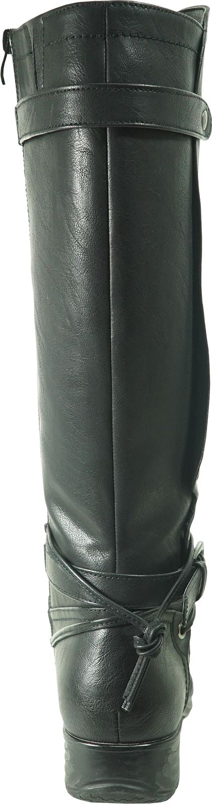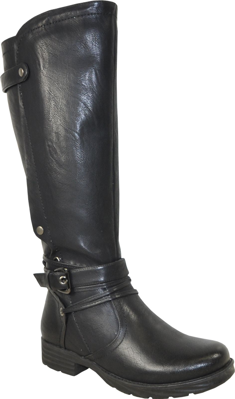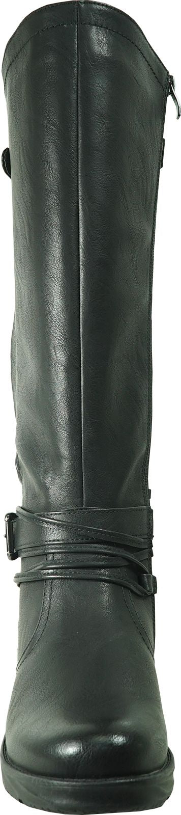 - Premium waterproof soft vegan leather upper in a knee-high riding boot features buckle straps at ankle and calf and a plain round toe