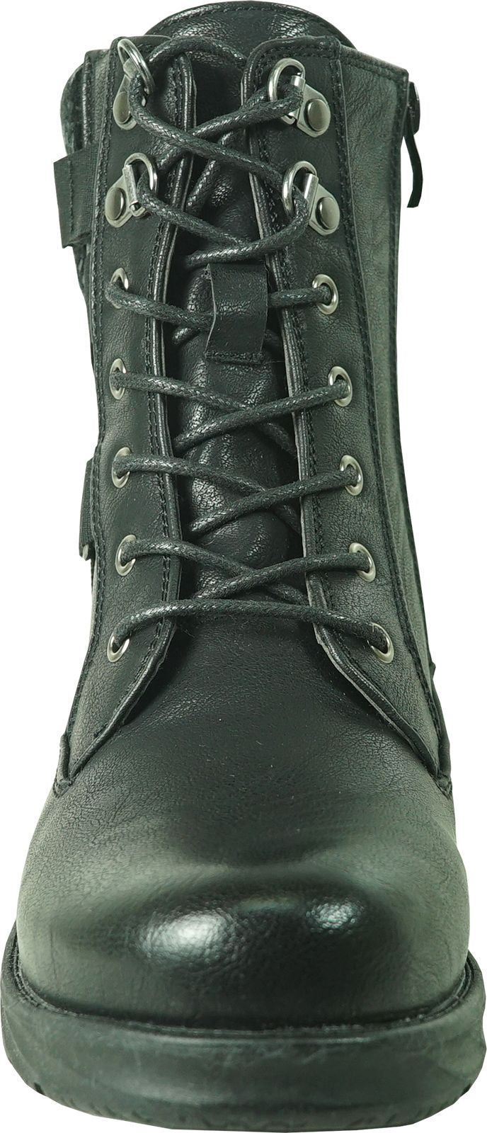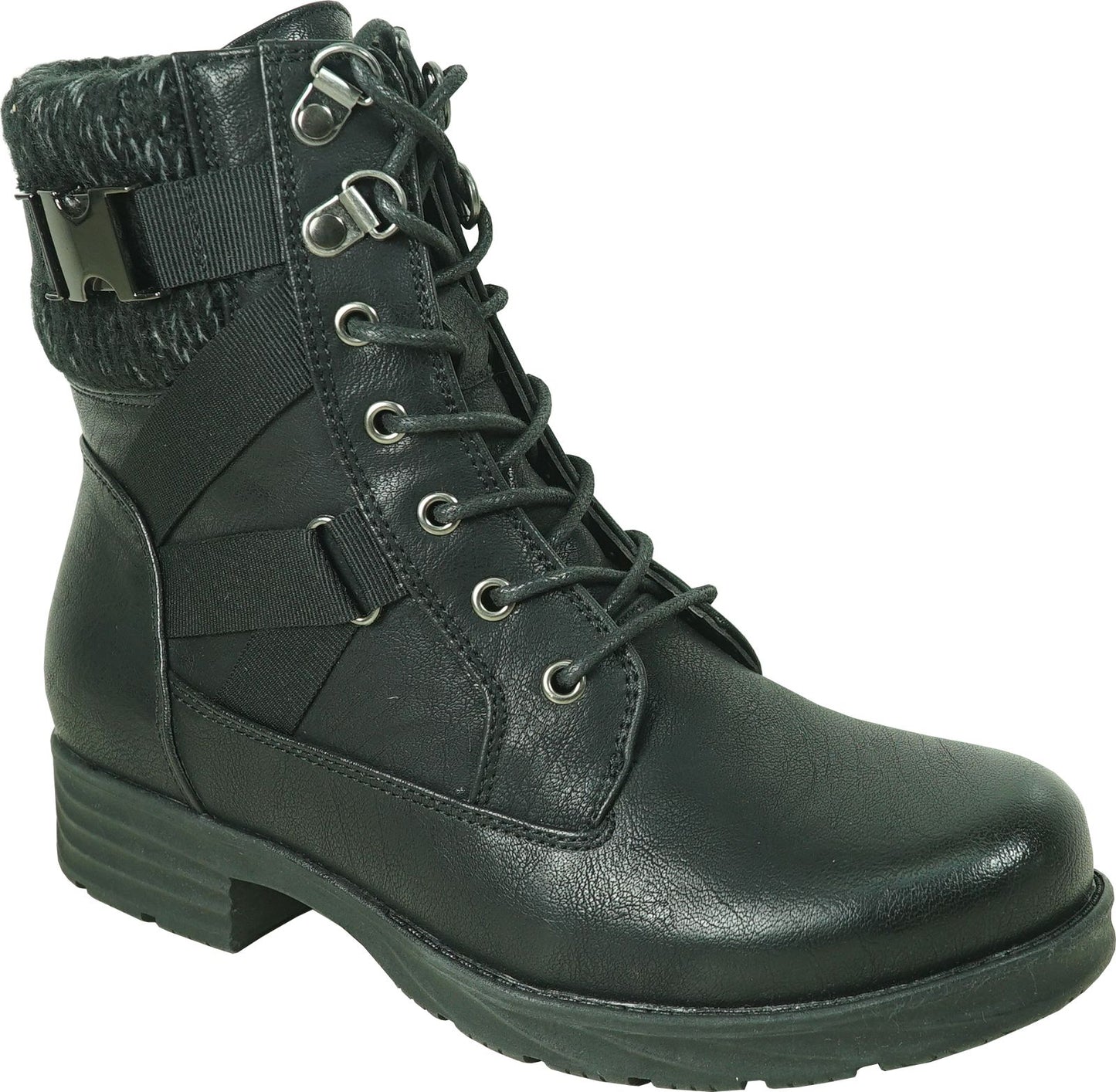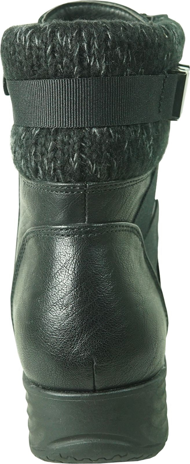 - Premium waterproof soft vegan leather upper featuring a cozy knit cuff and decorative buckle and strap with a plain round toe.