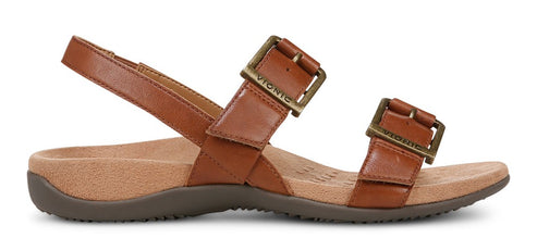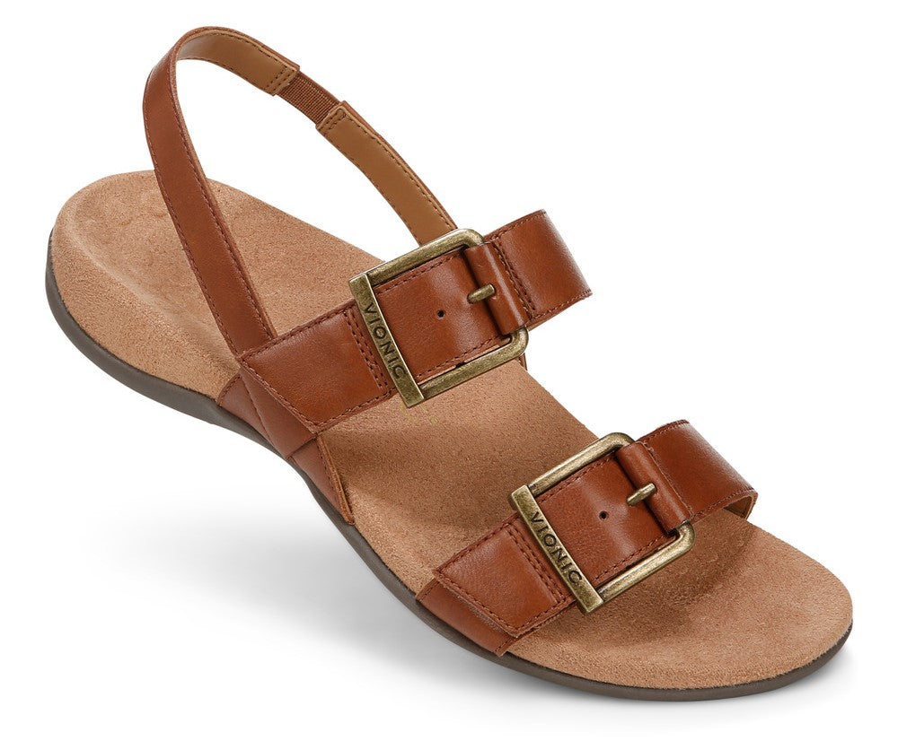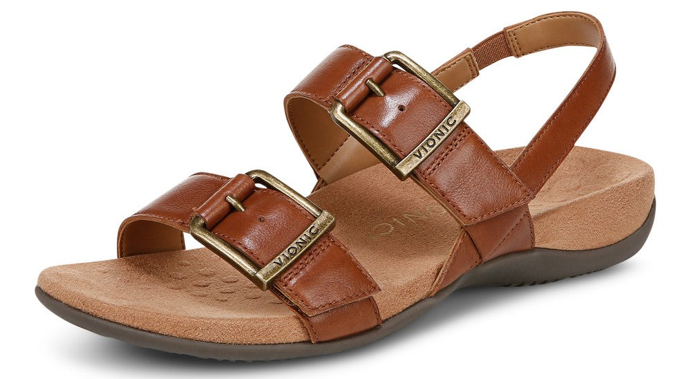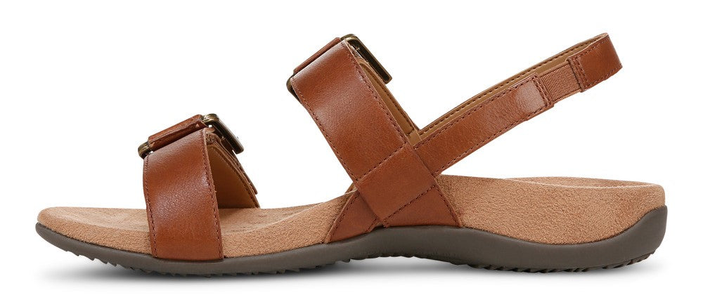 Leather sandal with two straps across the foot and a strap around the ankle, all secured with decorative metal buckles.